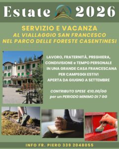 Una settimana (o anche di più, dipende da te) di servizio assieme a noi frati. Avrai la possibilità di gustare la fraternità francescana, il lavoro semplice e umile insieme, la preghiera condivisa, la gioia del tempo libero, di passeggiate fra i boschi e di chiacchierate serali attorno al fuoco.